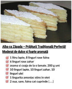 lba ca Zăpada”este unul dintre acele deserturi care aduc mereu un strop de magie pe masa noastră. Cu un gust delicat de lămâie și o textură moale, această prăjitură este preferată de toată familia și se prepară relativ ușor. O combinație perfectă de foi subțiri și cremă fină, care îți va aminti de bucuria momentelor petrecute în jurul mesei cu cei dragi.