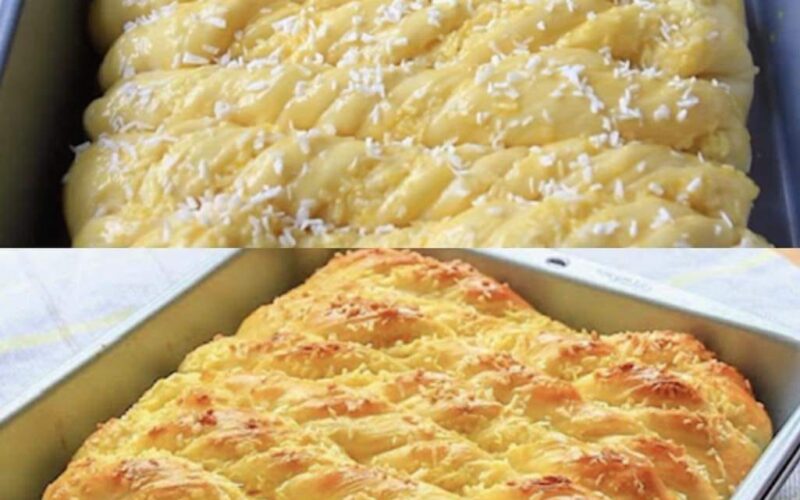 Acoperiți plăcinta cu folie și lăsați-o la căldură încă o jumătate de oră sau până când crește frumos. Apoi ungeți-o cu oul pe care l-ați lăsat deoparte (puteți adăuga câteva picături de unt deasupra) și presărați ușor cu cocos.