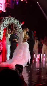 Andreea Bălan a transformat cel mai nou spectacol al său într-un moment cu aer de ceremonie, spre încântarea fanilor veniți la Sala Palatului. Artista a apărut pe scenă purtând o rochie de mireasă, cu voal și buchet, iar alături de ea s-a aflat partenerul ei, Victor Cornea, în costum de mire.