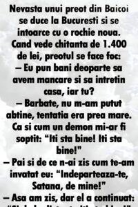 Când vede chitanţa de 1.400 de lei, preotul se face foc:– Eu pun bani deoparte să avem mâncare şi să întreţin casa, iar tu?– Bărbate, nu m-am putut abţine, tentaţia era prea mare. Ca şi cum un demon mi-ar fi şoptit: „Iţi stă bine! Iţi stă bine!”– Păi şi de ce n-ai zis cum te-am învăţat eu: „Îndepărtează-te, Satană, de mine!”– Aşa am zis, dar el a continuat: „Şi de la distanţă îţi stă bine!”