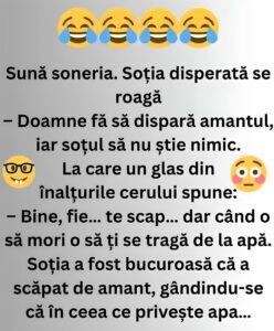 La care un glas din înalturile cerului spune: - Bine, fie…te scap… dar cand o să mori o să ți se tragă de la apa. Soția a fost bucuroasă ca a scăpat de amant, gândindu-se se că in ceea ce privește apa…va avea grijă și se va feri.