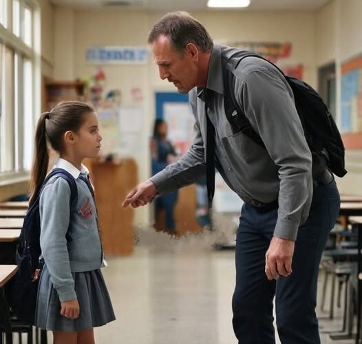 Dar doamna Evans nu se lăsă intimidată. O luă pe Lily de mână, îi aruncă lui Tom o privire severă și spuse hotărâtă: „Insist. Nu va dura mult.” O conduse pe Lily înapoi în clădirea școlii, cu pulsul accelerat. Odată ajunse în sala de clasă, închise ușa și se întoarse către fetiță. „Scumpo, poți să-mi spui ce se întâmplă? Îți este frică?”