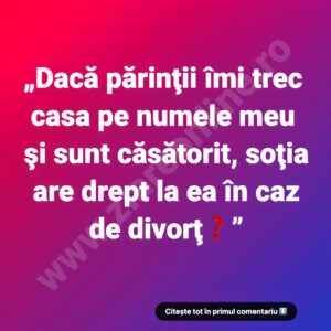 Pe de altă parte, dacă părinții au ales să doneze către ambii soți (amândoi figurează în act), casa devine bun comun și se împarte la divorț conform cotelor stabilite de instanță, ținând cont de contribuția fiecăruia.