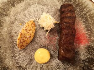 Acești mici premium nu seamănă deloc cu varianta tradițională, populară prin piețe și la grătarele din parc. Carnea provine din Japonia, este maturată la standarde de top (clasa A5, cel mai înalt nivel de calitate), iar prepararea este atent controlată pentru a evidenția gustul natural al ingredientului de bază. Alături de acești mici de lux, clienții primesc garnituri reinterpretate și un muștar artizanal, creat special pentru a completa aroma intensă a cărnii.