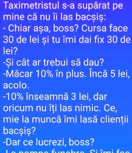 -Chiar așa, boss? Cursa face 30 de lei și tu îmi dai fix 30 de lei?
