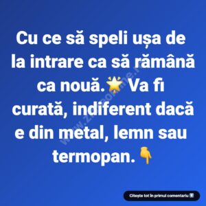 Ușa de la intrare este prima carte de vizită a locuinței: se murdărește repede de la praf, urme și intemperii, dar se curăță ușor cu o soluție blândă pe bază de apă călduță + detergent de vase. Metoda este potrivită pentru suprafețe din metal, lemn sau termopan (PVC) și funcțion