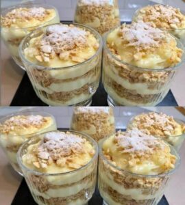 Repetă straturile de firimituri și cremă până umpli recipientele.