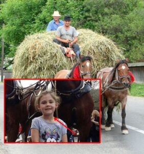Fetița se bucura de o zi frumoasă alături de familia ei. Era o sărbătoare și toți petreceau timp împreună într-un cadru festiv. Într-un colț al grădinii, se aflau câțiva cai Clydesdale, care păreau că așteaptă parada. Fetița era fascinată de aceste creaturi majestuoase, dar se simțea puțin temătoare să se apropie mai mult de ele.