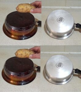 Luați un cartof, curățați-l de coajă și tăiați-l în jumătate. Ștergeți cu o jumătate de cartof oalele Secretul trucului este acidul oxalic, o substanță albă cristalină cunoscută pentru capacitatea sa de a îndepărta murdăria.