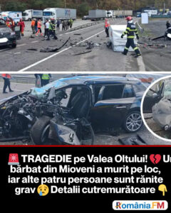 Un bărbat în vârstă de 42 de ani a murit, iar alte patru persoane au fost rănite, în urma unui grav accident rutier produs în această dimineață pe DN7, pe Valea Oltului. Evenimentul a avut loc în zona localității Racovița, județul Vâlcea, după ce două autoturisme s-au ciocnit frontal.