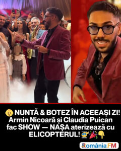 Armin Nicoară și Claudia Puican au organizat o petrecere de excepție, care a reunit nunta și botezul fiului lor, Amir Efrem, în vârstă de șase luni. Evenimentul a avut loc în această vară și a fost marcat de prezența unor nume importante din showbiz, dar și de momente spectaculoase, cum a fost sosirea nașei, Stana Stepănescu, cu elicopterul.