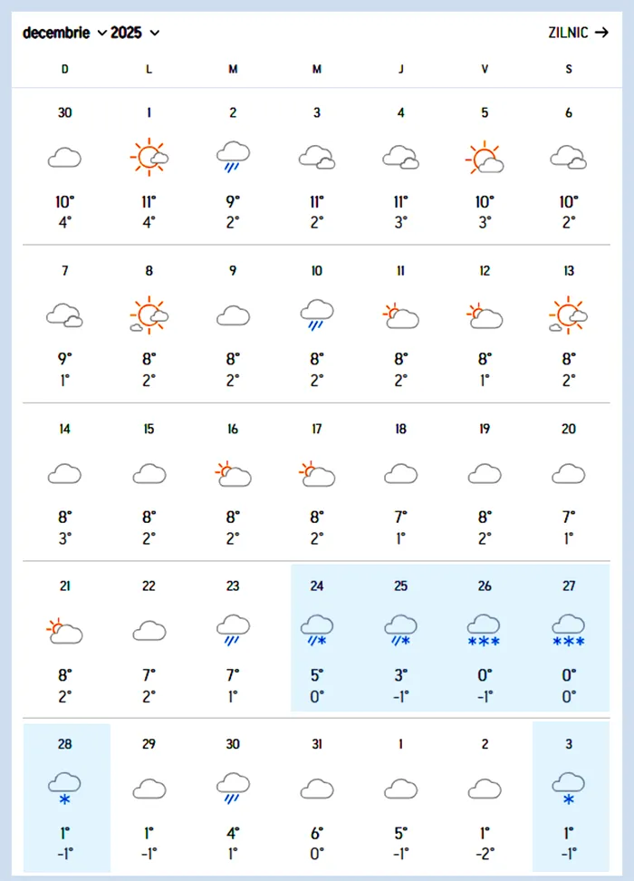 Se schimbă complet scenariul meteo pe care îl așteptam pentru finalul lunii decembrie. Conform celei mai noi prognoze actualizate, ninsorile ar urma să apară chiar în preajma sărbătorilor de iarnă.