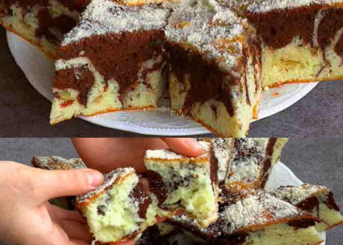 Puneți alternativ aluatul simplu și aluatul de cacao într-o tavă tapetată cu hârtie de copt și, la final, creați forme cu o scobitoare, astfel încât aluatul să se lege pe alocuri.