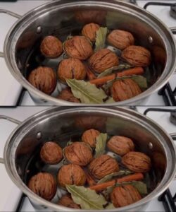 Metoda naturală Inițial, luăm o cratiță cu apă și o lăsăm să fiarbă cu nucile înăuntru timp de câteva minute, apoi adăugăm câteva foi de dafin și puțină scorțișoară. Când totul începe să fiarbă, adăugăm o lingură de oțet de mere și continuăm să fierbem amestecul încă câteva minute, apoi oprim focul și lăsăm să se răcească.