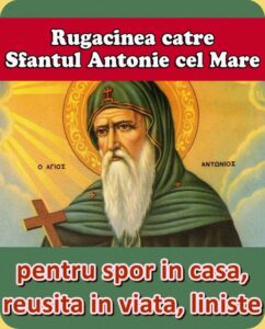 „Bunule Parinte Antonie, cel ce durerile si pacatele noastre le cunosti, nu trece cu vederea glasurile de rugaciune ale celor ce alearga la mijlocirea Ta si nu te uita la nevrednicia celor ce Te roaga, ci la slava si mila lui Dumnezeu, pe care Tu L-ai marturisit si spre care se indreapta rugaciunea ce Ti-o aducem.
