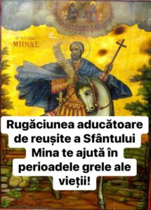 Ocrotitorul celor păgubiți, sfântul Mina este totodată grabnic ajutător și al celor care au fost înșelați. Rugați-vă cu încredere la moaștele acestuia care se află la Biserica Sfântul Mina din București și citiți totodată această rugăciune, având grijă să aprindeți întotdeauna o lumânare.