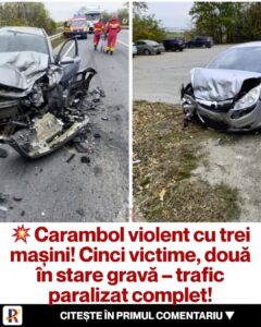 Un accident rutier grav, în care au fost implicate trei autovehicule, a avut loc pe Drumul Național 6, în apropierea localității Cârcea din județul Dolj. În urma impactului, cinci persoane au fost rănite, dintre care două se află în stare gravă, iar traficul a fost blocat complet pe ambele sensuri de mers.