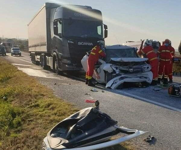 Loganul condus de către o femeie a fost spulberat din spate de un TIR. Din cauza impactului, mașina a fost strivită complet. Mașina acesteia a fost stricită și în partea din față, după ce a fost proiectată într-un alt tir.
