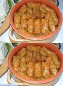 Puneți câte o lingură de compoziție pe fiecare frunză și rulați, având grijă să închideți capetele.