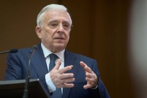 Mugur Isarescu, the Governor of the National Bank of Romania (BNR), presents the Quarterly Inflation Report, at the headquarters of the BNR in Bucharest. Central Bank of Romania, Q1 Report, Disinflationary Trend, Bucharest, Romania – 15 May 2024,Image: 873353633, License: Rights-managed, Restrictions: , Model Release: no